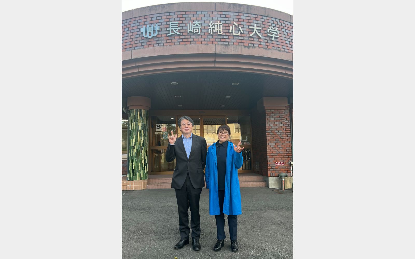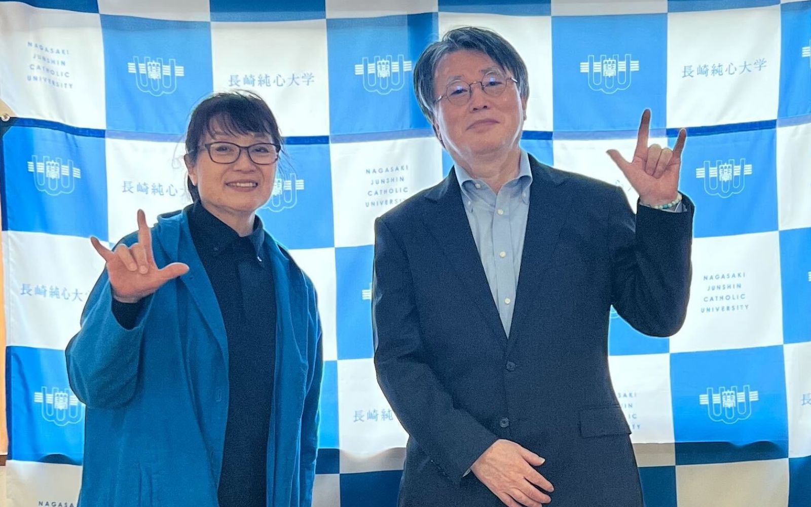 長崎純心大学は10年ほど前から、正規のカリキュラムとして全学科の学生を対象に手話講座を開講しています。今年度からは厚生労働省の「若年層の手話通訳者養成モデル事業」にも選ばれ、手話通訳士の資格を持つ長野秀樹教授とろう者の原田育子講師の二人が一緒に教える形で手話の普及啓発に取り組んでいます。大学が手話通訳者育成に果たす役割などについて、うかがいました。